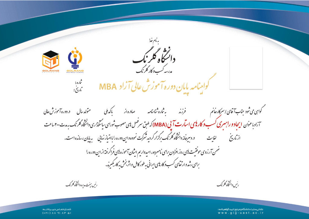 دوره MBA مکاتبه ای را به مدیران و کارآفرینان، دانشجویان برتر کشور و علاقه مندان به فعالیت در گروه صنعتی گلرنگ پیشنهاد می شود.